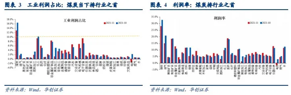 舉例而言,雖然近期煤炭價格持續(xù)走低,但就數(shù)據(jù)來看,當(dāng)下煤炭依然是工業(yè)企業(yè)中最賺錢的行業(yè)。以2021年11月為例,根據(jù)華創(chuàng)證券研報,煤炭行業(yè)的利潤占工業(yè)企業(yè)總利潤的比重為12.9%,為36個細分行業(yè)之首;利潤率為27.8%,同樣位居36個細分行業(yè)之首。