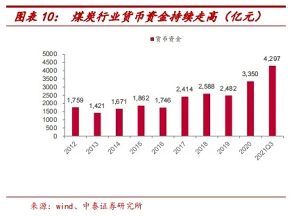 回溯歷史,一方面,“十三五”期間政府大力推行的供給側(cè)結(jié)構(gòu)性改革,實現(xiàn)了行業(yè)產(chǎn)能快速出清,煤企經(jīng)營活動產(chǎn)生的現(xiàn)金流入持續(xù)走高;另一方面,當(dāng)前“碳中和”政策對行業(yè)新增產(chǎn)能投資形成有效抑制,投資活動產(chǎn)生的現(xiàn)金流出持續(xù)走低。這一背景下,截至2021年第三季度末,煤炭行業(yè)貨幣資金達到4297億元,是2016年末的2.5倍。
