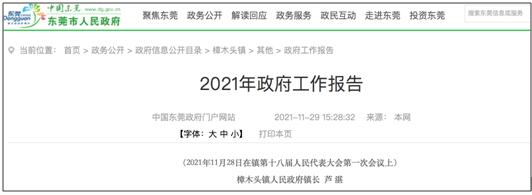 在東莞市人民政府網(wǎng)站上,有一篇"2021年政府工作報告"特別引人矚目。這篇報告于2021年11月29日發(fā)布,其為2021年11月28日在鎮(zhèn)第十八屆人民代表大會第一次會議上發(fā)布,落款是樟木頭鎮(zhèn)人民政府鎮(zhèn)長蘆湛。