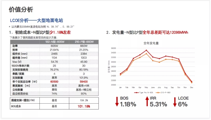 以內(nèi)蒙某200MW電站為例,Tiger Neo-605W與常規(guī)210PERC產(chǎn)品660W對(duì)比來看,其BOS成本可降低1.18%左右,度電成本下降6%,IIR可提高5.31%。叢秋實(shí)表示,目前主流支架廠家、逆變器廠家的相關(guān)產(chǎn)品已經(jīng)可以全面適配以N型組件構(gòu)建的光伏系統(tǒng)。