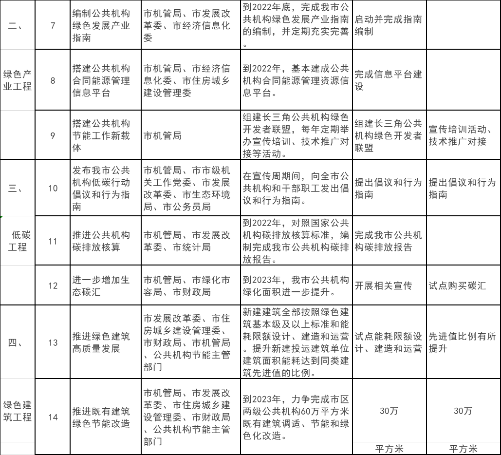 支持資源節(jié)約和循環(huán)利用、可再生能源和新能源利用、節(jié)能降碳新技術(shù)新產(chǎn)品研發(fā)及推廣應(yīng)用,積極宣貫我市公共機(jī)構(gòu)綠色發(fā)展相關(guān)政策,鼓勵(lì)更多的公共機(jī)構(gòu)將綠色低碳循環(huán)發(fā)展作為自身發(fā)展的重要方向。推動(dòng)公共機(jī)構(gòu)與綠色產(chǎn)業(yè)深度融合,構(gòu)建公共機(jī)構(gòu)綠色發(fā)展產(chǎn)業(yè)治理格局。到2022年底,完成我市公共機(jī)構(gòu)綠色發(fā)展產(chǎn)業(yè)指南的編制,并定期充實(shí)完善。