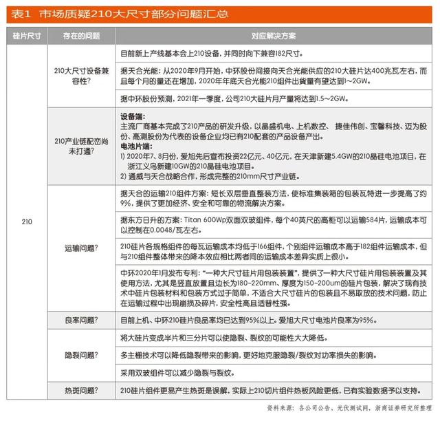 市場接受度且先不談,對于光伏組件廠家來說,這兩條路徑選擇的最大沖突集中于投入成本和風險上。如果選擇第一條路徑,相對來說,廠家需要耗費產(chǎn)線升級及相關(guān)人力投入的成本,但第二條路徑卻需要新建產(chǎn)線乃至廠房,其中購買新設(shè)備就是一筆大投入。兩相比較,后者投入的成本更高、冒的風險更大。這也是在初期天合光能在行業(yè)內(nèi)倡導生產(chǎn)和使用210硅片卻得不到上下產(chǎn)業(yè)鏈支持的主要原因。如今,經(jīng)過兩年多的努力,天合光能將210硅片的盟友發(fā)展到39家,包括上游供應商、下游應用客戶乃至同行。目前,182硅片和210硅片兩條路線已經(jīng)成為未來光伏組件廠家拓展大尺寸市場的選擇。但相比于182硅片,210硅片的“大躍進”也讓其充滿質(zhì)疑,比如在設(shè)備兼容性、產(chǎn)業(yè)鏈配套、運輸、良率、熱斑等等方面。根據(jù)浙商證券整理,如表1所示,天合光能、中環(huán)股份、晶盛機電、上機數(shù)控、愛旭股份、通威集團、東方日升等上下游已經(jīng)就210大尺寸存在的問題進行研發(fā)、解決。