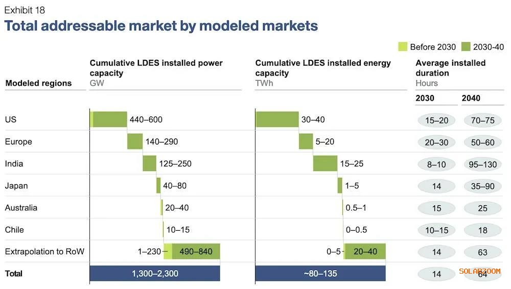 在澳大利亞,如下圖所示,該報(bào)告顯示,從2030年到2040 年,長(zhǎng)時(shí)儲(chǔ)能的總潛在市場(chǎng)在20-40GW和0.5-1 TWh之間。