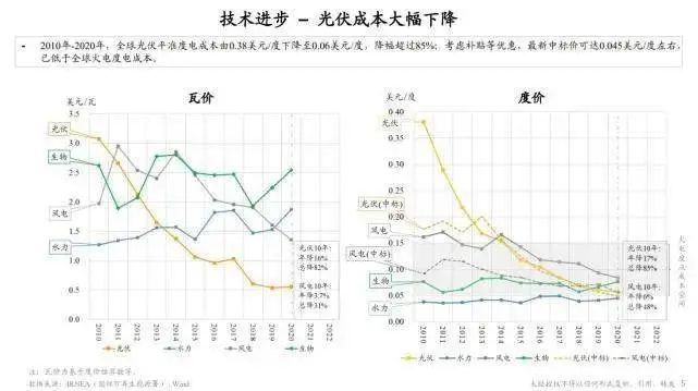 再看新優(yōu)勢,就是技術(shù)進步使得光伏成本大幅下降。在過去的十年,光伏的度電價格降幅超過85%。左圖中每瓦的光伏裝機的價格有一個很大的降幅,然后看右圖中光伏每度電的價格也有了大幅度下降,這也是在幾種不同的可再生能源類別中成本降幅最快的,這樣的話就大大提升了光伏的經(jīng)濟可行性。