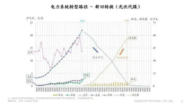 下面我們談一下,如果經(jīng)過進一步論證,證明光伏能源作為一個可再生能源,有足夠大的規(guī)??梢蕴娲禾孔瞿茉吹幕A(chǔ),我們應(yīng)該怎么轉(zhuǎn)型?下面這張圖上左邊這一半實際上是2000年到2020年整個電力企業(yè)的裝機總量在不斷累積增加,今天大約有70%的發(fā)電還是用火電的技術(shù)設(shè)備。那么面向未來,我們可以怎么調(diào)整?這就是一個轉(zhuǎn)型路徑的問題。在這里我們有一個策略,這些煤電既然已經(jīng)建了,那么就讓它在工作壽命期持續(xù)工作,隨著時間推延,每年會有折舊的、退役下來的,那在新增的發(fā)電能力上,就不再做傳統(tǒng)電源的投資,而是把新的投資都集中在光伏類型的新能源,這樣就會每年有一個逐漸等量替換的概念。同時如果有新的經(jīng)濟增長需求,光伏的投資根據(jù)實際情況也可以略微增加,這樣的話就可以用大概20年完成一個自然的能源轉(zhuǎn)型,最終實現(xiàn)用光伏來替代煤炭,實現(xiàn)我們的“雙碳”目標。