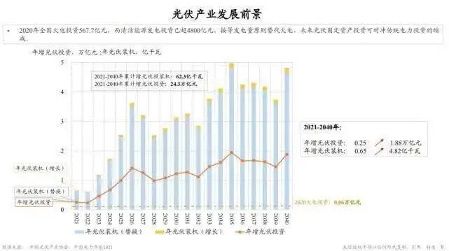 按照剛才的演進路徑,光伏產(chǎn)業(yè)投資假如從2021年開始,新增的電源都是由光伏裝機來實現(xiàn),那么下面這張圖就展示了未來的20年的一個投資逐漸增加的過程,從開始大概0.25萬億,到后來大概2萬億的年投資,整個全過程完成約20年,總共的投資規(guī)模大概是20多萬億元。