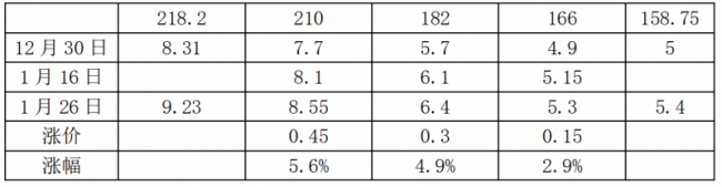 1月26日,中環(huán)股份發(fā)布P型單晶硅片最新價(jià)格公示。與1月16日?qǐng)?bào)價(jià)相比,各尺寸硅片價(jià)格均有一定幅度上漲。以160μm厚度為例,具體見下表:
