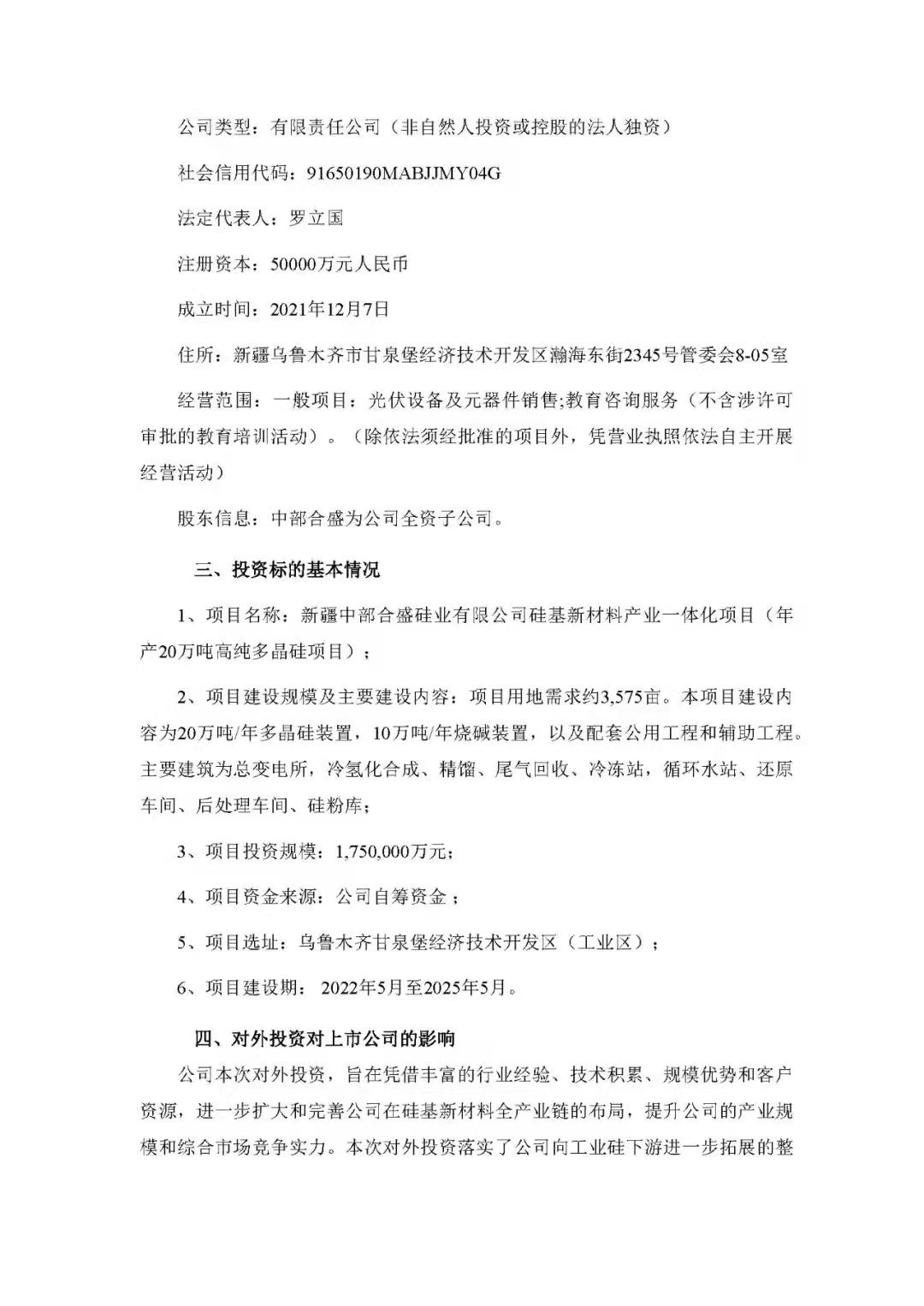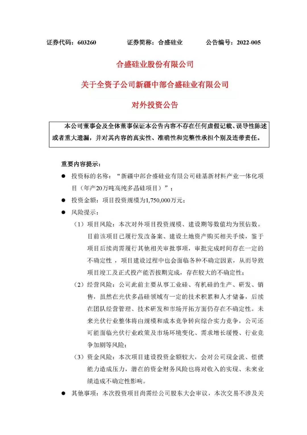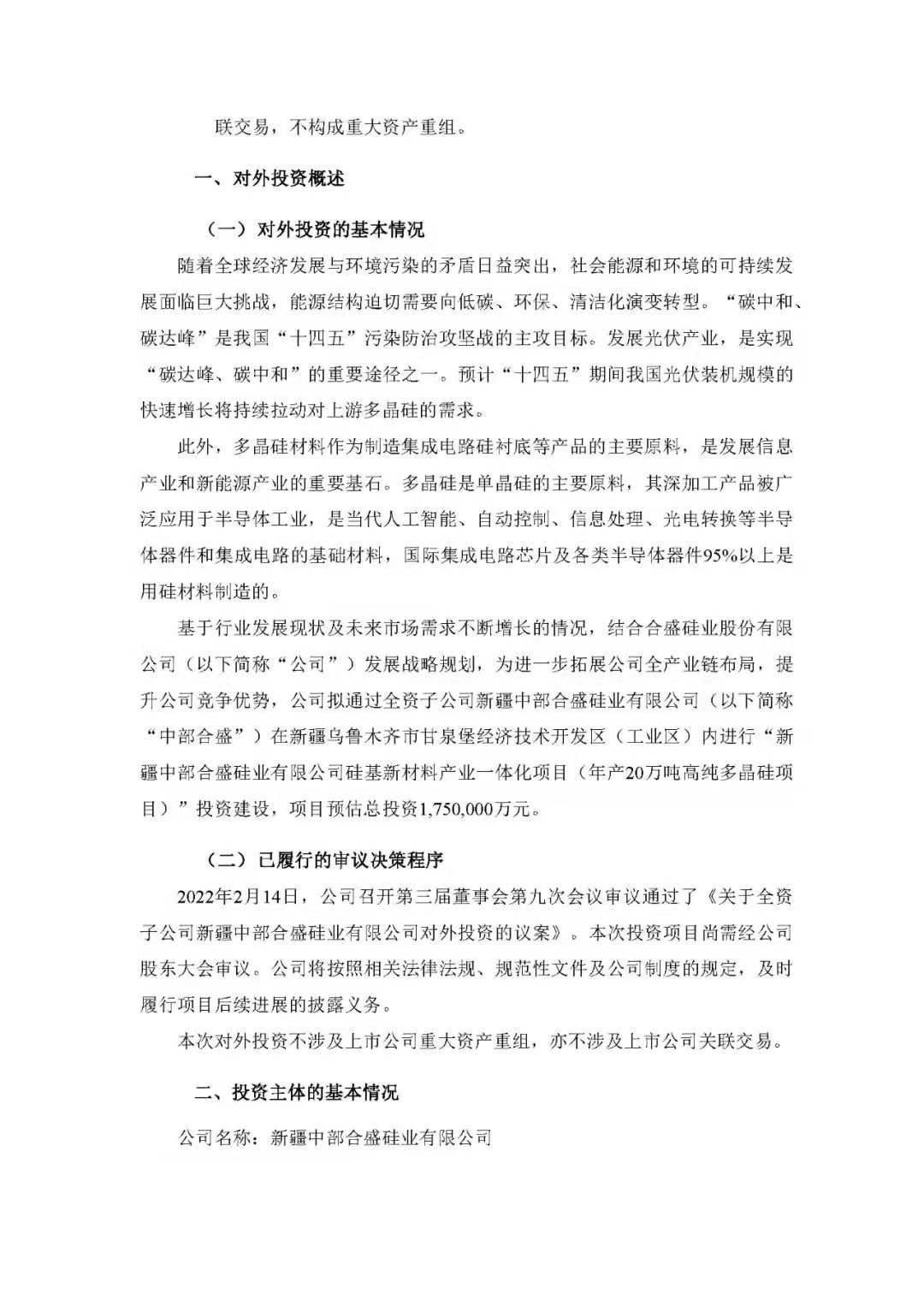 2月14日,合盛硅業(yè)發(fā)布公告稱,擬通過全資子公司中部合盛在新疆烏魯木齊市甘泉堡經(jīng)濟技術開發(fā)區(qū)(工業(yè)區(qū))內(nèi)進行“新疆中部合盛硅業(yè)有限公司硅基新材料產(chǎn)業(yè)一體化項目(年產(chǎn)20萬噸高純多晶硅項目)”投資建設,項目預估總投資1,750,000萬元。