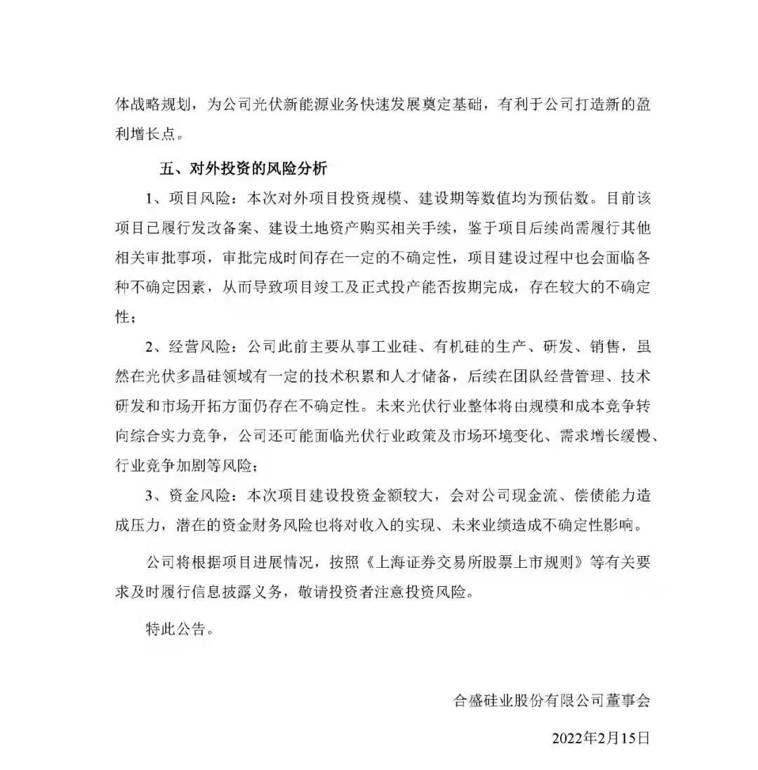 公司本次對外投資,旨在憑借豐富的行業(yè)經(jīng)驗、技術積累、規(guī)模優(yōu)勢和客戶資源,進一步擴大和完善公司在硅基新材料全產(chǎn)業(yè)鏈的布局,提升公司的產(chǎn)業(yè)規(guī)模和綜合市場競爭實力。本次對外投資落實了公司向工業(yè)硅下游進一步拓展的整體戰(zhàn)略規(guī)劃,為公司光伏新能源業(yè)務快速發(fā)展奠定基礎,有利于公司打造新的盈利增長點。
