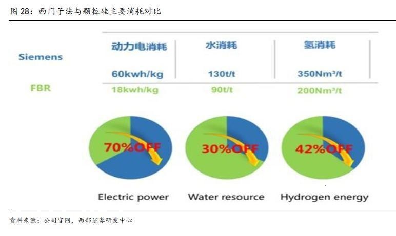西部證券認(rèn)為,“目前生產(chǎn)1千克顆粒硅耗電僅18度,相較于西門子法60度/千克有顯著下降;水耗氫耗方面,F(xiàn)BR方法較西門子法降低30%-42%;投資方面,顆粒硅每萬噸產(chǎn)能僅需要7億初始投資,相較西門子法可降低1.5-2億元,具備成本優(yōu)勢。”