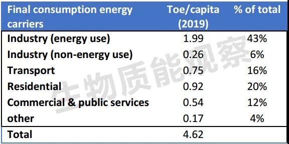 從能源消費(fèi)結(jié)構(gòu)上看,芬蘭的人均最終能源消耗約為4.6 噸油當(dāng)量 (toe),約為IEA生物質(zhì)能成員國(guó)人均能源消費(fèi)平均值的兩倍。芬蘭工業(yè)基礎(chǔ)比較發(fā)達(dá),工業(yè)占能源總消耗的比例高達(dá)49%。住宅能源消耗約為能源總消耗的20%,高于交通運(yùn)輸?shù)?6%。(如表1所示)。