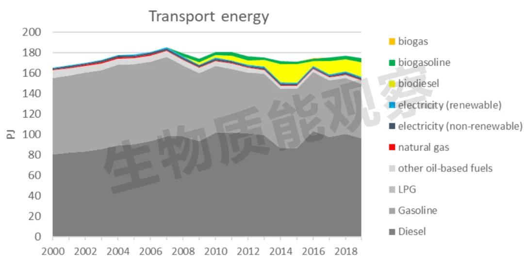 生物液體燃料于 2008 年推出,其使用量在最初幾年逐漸增加。從 2013 年到 2014 年,生物柴油從 6 PJ 增加到 18 PJ,2019 年生物柴油占柴油燃料消耗的 13%。生物燃料乙醇在過(guò)去 10 年中在 2.5 到 3.5 PJ 之間波動(dòng),占當(dāng)前汽油消耗的6.5%。