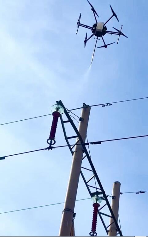 輸電線路復(fù)合絕緣子在運(yùn)行過(guò)程中,在強(qiáng)電場(chǎng)、日光照射、濕度、酸雨、環(huán)境污染等作用下,硅橡膠材料老化,引起憎水性下降或喪失,直接影響輸電設(shè)備的防污閃性能,導(dǎo)致線路故障。常態(tài)化開(kāi)展憎水性試驗(yàn),對(duì)保證電網(wǎng)安全穩(wěn)定運(yùn)行至關(guān)重要。傳統(tǒng)的試驗(yàn)方式需要人攜帶專(zhuān)業(yè)設(shè)備登塔檢測(cè),為提升工作效率,降低作業(yè)人員安全風(fēng)險(xiǎn),該公司輸電運(yùn)檢中心在無(wú)人機(jī)下方掛接了水槍噴頭和云臺(tái)相機(jī),自主研制了無(wú)人機(jī)憎水性試驗(yàn)設(shè)備,改變了傳統(tǒng)人工登塔作業(yè)方式,開(kāi)啟了復(fù)合絕緣子健康狀態(tài)檢測(cè)“智”時(shí)代。