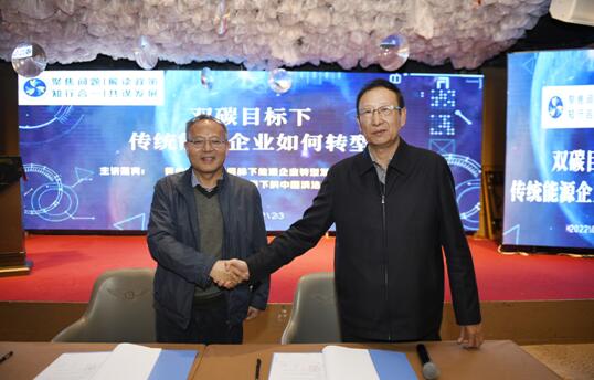 中國能源研究會(huì)碳中和產(chǎn)業(yè)合作中心主任黃少中(左)和榆林市企業(yè)聯(lián)合會(huì)會(huì)長高嶇(右)簽署合作文件