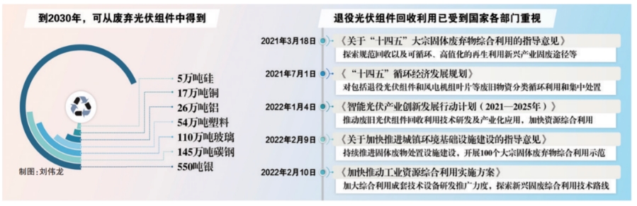 我國已成為全球最大的光伏組件生產(chǎn)國和全球最大的光伏發(fā)電應(yīng)用國家。據(jù)國際可再生能源機構(gòu)預測,2025年起我國開始面臨大批量的光伏組件退役,2030年報廢光伏組件將達到150萬噸,我國光伏組件報廢量在2060年前會以每年30%的速度增長。報廢光伏組件回收與綠色處置作為光伏產(chǎn)業(yè)鏈的最后一環(huán),是光伏產(chǎn)業(yè)閉環(huán)綠色可持續(xù)發(fā)展的最終保障。