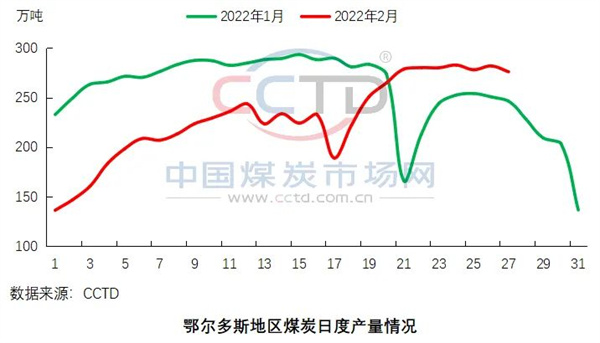 供應(yīng)端產(chǎn)地煤炭供應(yīng)持續(xù)增加。近期,產(chǎn)地在產(chǎn)煤礦產(chǎn)量繼續(xù)增加,根據(jù)CCTD中國煤炭市場(chǎng)網(wǎng)監(jiān)測(cè)的數(shù)據(jù)顯示,截至目前,鄂爾多斯地區(qū)在產(chǎn)煤礦數(shù)量已提升至232座,環(huán)比上周同期增加7座,區(qū)域內(nèi)煤炭日產(chǎn)量已穩(wěn)定在280萬噸/日左右高位水平。