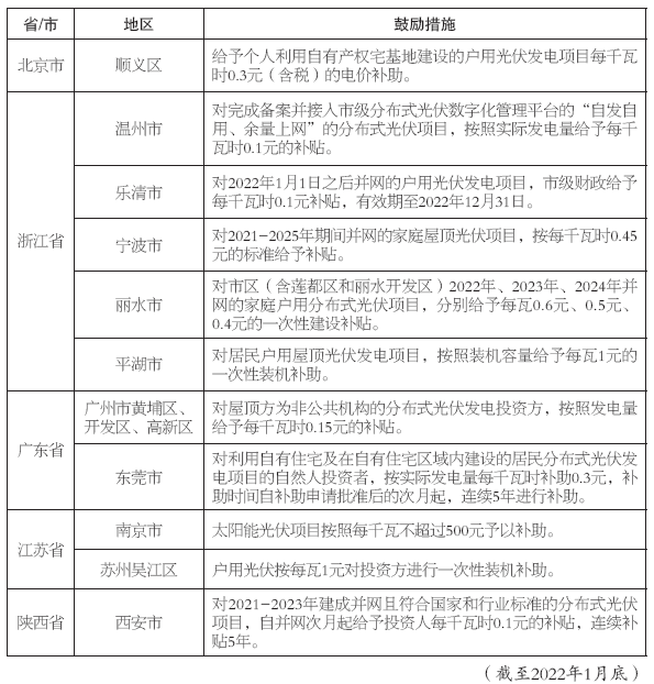2022年新建項目國家補貼政策還未明確,戶用光伏平價上網(wǎng)已被業(yè)內(nèi)認為是大勢所趨。據(jù)不完全統(tǒng)計,截至2022年1月底,已有北京、浙江、江蘇等省(市)的二十多個地區(qū)提出了分布式光伏新增項目電價補貼、補助或獎勵政策,部分地區(qū)還為戶用光伏項目設(shè)置了專項補貼,以期吸引更多社會資本進入當?shù)貞粲霉夥袌觥?/p>
