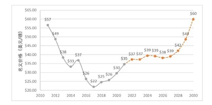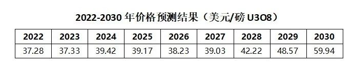 報(bào)告還對(duì)2022-2030年天然鈾現(xiàn)貨價(jià)格作了預(yù)測。之所以選擇對(duì)長期現(xiàn)貨價(jià)格進(jìn)行預(yù)測,是因?yàn)樵搩r(jià)格是反應(yīng)市場供需關(guān)系的主要指標(biāo),是長貿(mào)協(xié)議引用的重要指數(shù),且不易受到短期市場投機(jī)行為的影響。