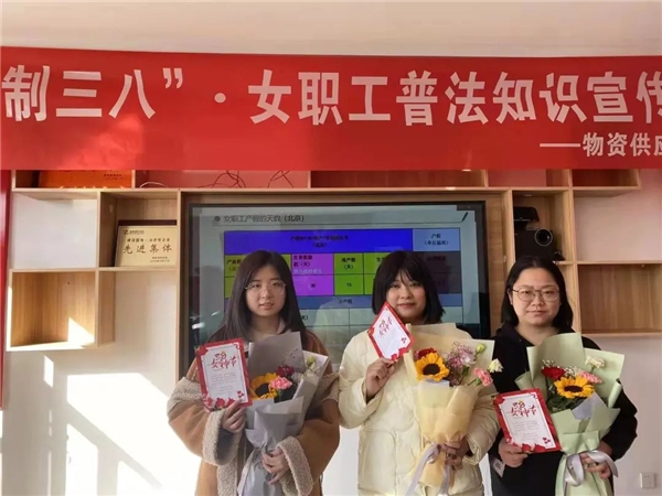為進(jìn)一步貫徹落實(shí)公司工會(huì)加強(qiáng)女職工勞動(dòng)保護(hù)工作,更好的維護(hù)女職工合法權(quán)益,在“三八”國際勞動(dòng)?jì)D女節(jié)來臨之際,物資供應(yīng)處以貫徹實(shí)施新修改的《工會(huì)法》和《女職工勞動(dòng)保護(hù)特別規(guī)定》頒布十周年為契機(jī),3月8日在物資供應(yīng)處組織部門女職工開展了“法制三八”·女職工普法知識(shí)宣傳活動(dòng)。