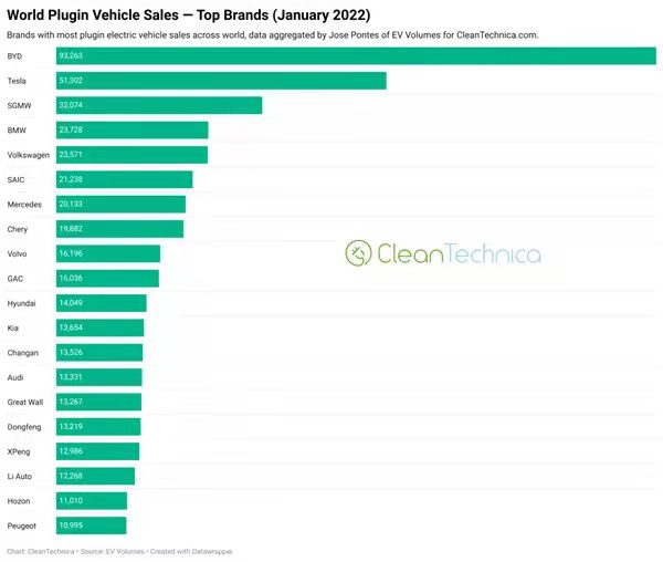 而1月份全球新能源銷量榜單中,比亞迪以93,263輛的成績,大幅領(lǐng)先特斯拉,奪得全球新能源銷冠的稱號。