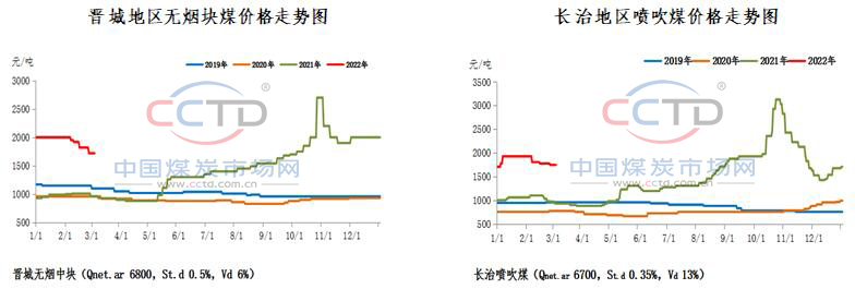 本周無煙煤市場成交繼續(xù)好轉,無煙末煤、無煙噴吹煤價格止跌企穩(wěn),偏低價格有所反彈,無煙塊煤價格仍延續(xù)偏弱。無煙末煤方面,本周下游用戶需求繼續(xù)回暖,煤礦端銷售逐漸轉好。加上近期國際局勢緊張,俄烏沖突引發(fā)的國際能源緊張預期推升國際煤炭價格大幅上漲,動力煤、焦煤等相關煤種價格偏強,對無煙末煤價格形成支撐,本周無煙末煤價格整體止跌趨穩(wěn)。無煙塊煤方面,隨著天氣回暖,民用市場需求繼續(xù)減弱,化工用戶開工小幅下滑,買漲不買跌心態(tài)下,采購謹慎,維持小單剛需補貨,無煙塊煤需求端支撐偏弱,本周無煙塊煤價格延續(xù)小幅下行走勢。無煙噴吹煤方面,本周國內(nèi)噴吹煤市場成交明顯增多,價格趨強運行。供應端,目前坑口供應趨穩(wěn)定,隨著煤礦出貨好轉,坑口庫存逐漸下降,對噴吹煤價格有支撐。下游需求方面,近期河北、山東部分鋼廠開工陸續(xù)提升,噴吹煤需求量增加,且鋼焦市場行情運行良好,下游采購積極性明顯提升,補庫需求加快釋放,噴吹煤需求端支撐趨強。