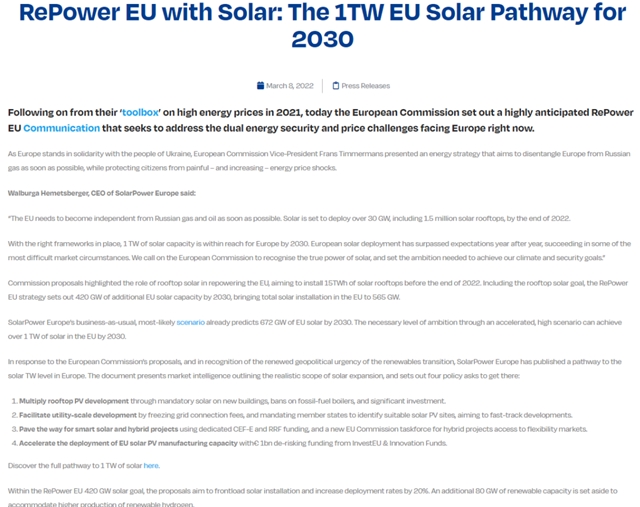 近日,國(guó)際能源價(jià)格飆升,油價(jià)、天然氣創(chuàng)歷史新高,能源安全再次被各國(guó)重新定義。在此背景下,3月8日SolarPower Europe 官網(wǎng)發(fā)布了題為“RePower EU with Solar: The 1TW EU Solar Pathway for 2030”的信息。