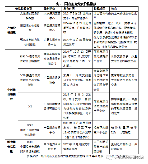 目前,市場(chǎng)上的煤炭?jī)r(jià)格指數(shù)主要分為產(chǎn)地、中轉(zhuǎn)地及消費(fèi)地三類。其中,產(chǎn)地價(jià)格指數(shù)主要為“三西”地區(qū)各自的煤炭交易中心發(fā)布的價(jià)格指數(shù);中轉(zhuǎn)地價(jià)格指數(shù)即港口價(jià)格指數(shù),代表性指數(shù)為環(huán)渤海價(jià)格指數(shù)(以5500大卡為代表)、CCTD指數(shù)、NCEI國(guó)煤下水動(dòng)力煤(808, -14.00, -1.70%)價(jià)格指數(shù)、CCI 指數(shù)等,該類價(jià)格指數(shù)使用最為普遍,是現(xiàn)行電煤長(zhǎng)協(xié)定價(jià)的主要依據(jù)之一;消費(fèi)地價(jià)格指數(shù)的代表為中國(guó)沿海電煤采購(gòu)價(jià)格綜合指數(shù)。煤炭?jī)r(jià)格指數(shù)具體如表2所示。