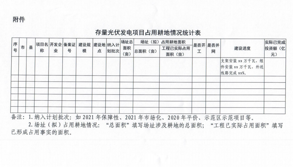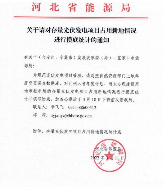3月11日,河北省能源局啟動(dòng)存量光伏電站占用耕地摸底統(tǒng)計(jì)工作,文件要求對(duì)照自然資源部門土地年度變更調(diào)查數(shù)據(jù)庫(kù),對(duì)已列入省年度計(jì)劃、尚未辦理建設(shè)用地審批手續(xù)的存量光伏發(fā)電項(xiàng)目占用耕地情況進(jìn)行摸底統(tǒng)計(jì)。附表信息統(tǒng)計(jì)中包括項(xiàng)目名稱、開(kāi)發(fā)企業(yè)、備案證號(hào)、建設(shè)規(guī)模及地點(diǎn)、納入計(jì)劃批次以及場(chǎng)址總面積、已占用面積以及建設(shè)進(jìn)度等多項(xiàng)詳細(xì)信息。