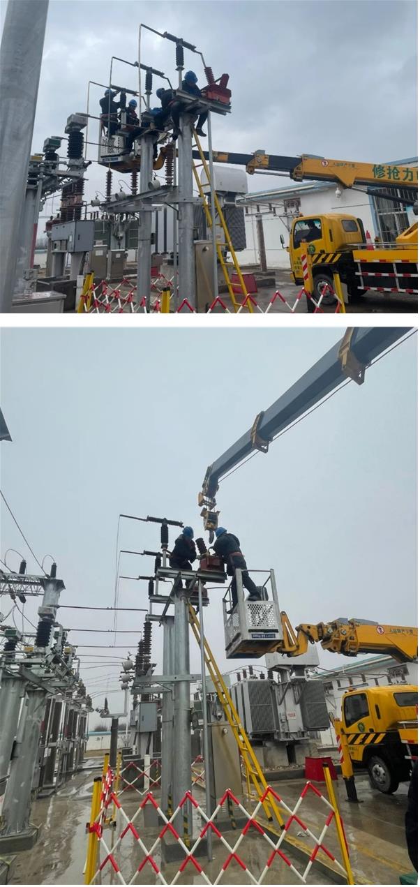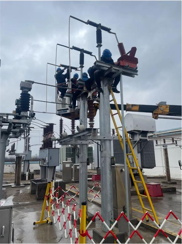 天公不作美,兩天的工作時(shí)間,雨雪交加,氣溫一降再降,給搶修帶來極大的考驗(yàn),工作人員為及早恢復(fù)供電沒有因天氣原因停止手上的工作,迎著冷風(fēng),試驗(yàn)人員先行對(duì)新互感器進(jìn)行試驗(yàn),試驗(yàn)合格后檢修人員爬上電壓互感器架構(gòu)上,拆除一次引線,緊接著保護(hù)人員拆除二次部分接線,將互感器兩側(cè)的引線分別拆下后,檢修人員指揮吊車司機(jī)起吊舊互感器、加裝新互感器,并對(duì)接線板進(jìn)行反復(fù)打磨和擦拭,去除表面氧化膜,使之保持良好導(dǎo)電性,一次工作結(jié)束,保護(hù)人員隨即接二次線。從拆除舊設(shè)備到起吊更換新設(shè)備,再到安裝、試驗(yàn)、調(diào)試完成,每個(gè)工序都嚴(yán)格按照規(guī)程要求開展,經(jīng)過十幾個(gè)小時(shí)的忙碌,三相電壓互感器全部更換完成。