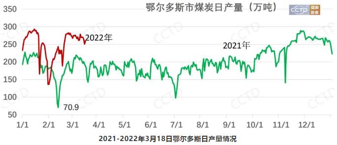產(chǎn)地供煤維持高位。主產(chǎn)地積極響應(yīng)保供穩(wěn)價號召,加之目前價格礦方生產(chǎn)積極性普遍偏高,產(chǎn)量持續(xù)穩(wěn)定在高位。根據(jù)CCTD中國煤炭市場網(wǎng)監(jiān)測的數(shù)據(jù)顯示,3月18日當(dāng)周,鄂爾多斯日均產(chǎn)量266萬噸/日,周環(huán)比基本持平,同比增加66萬噸/日。