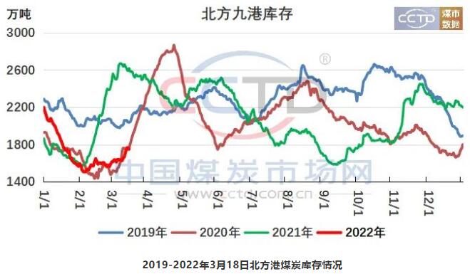 首先,庫存緩沖作用減弱,價格彈性大。一是,2022年以來,終端持續(xù)去庫,即使春節(jié)期間也一反往年補(bǔ)庫常態(tài)。截至3月18日,降至8675萬噸,較年初下降2518萬噸。二是,港口作為“蓄水池”,“水位”遲遲漲不上來。截至3月18日,北方九港庫存1748萬噸,周環(huán)比增加121萬噸,同比減少868萬噸。