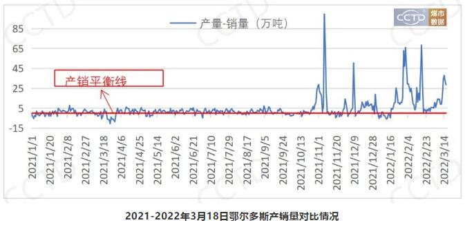 其次,產(chǎn)銷差異常,坑口快速補(bǔ)庫。3月18日當(dāng)周,鄂爾多斯日均銷量243萬噸/日,同比增加41萬噸/日,周環(huán)比減少16萬噸/日。通過“2021-2022年3月17日鄂爾多斯產(chǎn)銷量對比情況”圖也可以看出,自3月份以來,鄂爾多斯產(chǎn)量持續(xù)大于銷量、產(chǎn)銷差不斷擴(kuò)大,且持續(xù)時間較長,階段性打破了“以銷定產(chǎn)、產(chǎn)銷動態(tài)平衡”的局面。