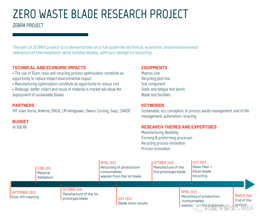 ZEBRA零廢葉片研究項(xiàng)目于 2020 年 9 月正式啟動,由法國凡爾納國際研究中心(IRT Jules Verne)領(lǐng)導(dǎo)發(fā)起,這家獨(dú)特的合作伙伴組織匯集了包括阿科瑪、CANOE、Engie、LM Wind Power、歐文斯科寧和 SUEZ 在內(nèi)的多家工業(yè)公司。項(xiàng)目預(yù)算超過1850萬歐元。