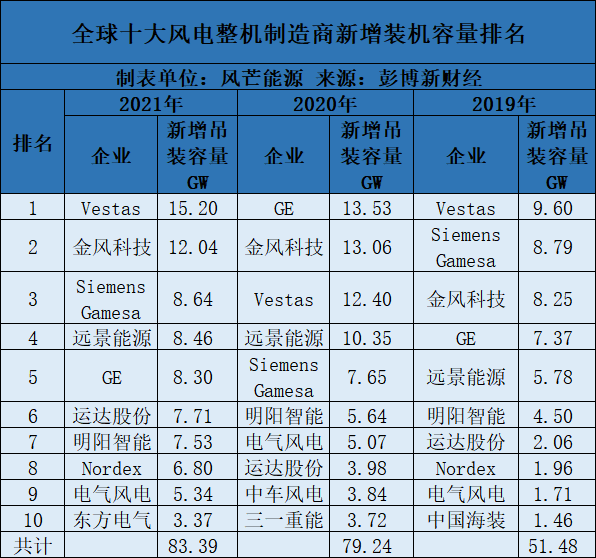 風(fēng)芒能源獲悉,3月23日,彭博新財(cái)經(jīng)發(fā)布2021年全球風(fēng)電整機(jī)制造商市場(chǎng)份額排名。