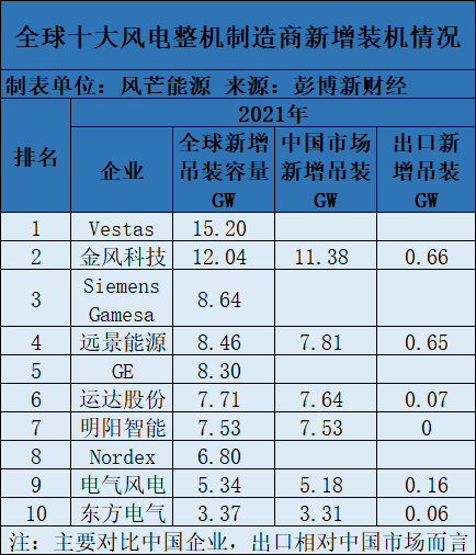 中國(guó)在2021年繼續(xù)穩(wěn)居全球最大風(fēng)電市場(chǎng)的位置,美國(guó)以13GW的新增裝機(jī)容量位列第二,兩國(guó)共計(jì)占全球新增裝機(jī)容量超過(guò)三分之二。越南首次突圍進(jìn)入前三,在2021年實(shí)現(xiàn)裝機(jī)3.6GW。 對(duì)比全球與中國(guó)市場(chǎng)新增裝機(jī)情況,可以看到,在中國(guó)整機(jī)商中,2021年金風(fēng)科技、遠(yuǎn)景能源出口最多。