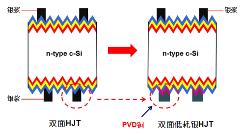 據悉,低銀耗異質結技術采用背面PVD鍍銅層,是金石能源的一項專利技術。該技術與銀銅混合的“銀包銅”工藝完全不同,在材料開發(fā)和制作工藝方面,其采用“正面銀漿、背面鍍銅”方案,做到了正面使用低溫銀漿,背面采用PVD鍍銅層技術,僅需保留少量背面細柵,大幅度減少了銀漿的使用量。電池的低溫銀漿單耗僅為13mg/W,柵線電極成本可降至0.09元/W。