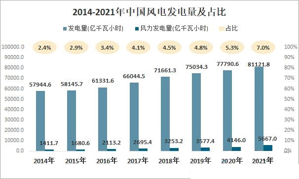 近年來,我國風電發(fā)電量占比不斷提升,2021年中國風電發(fā)電量占總發(fā)電量的7.0%,較2014年提升4.6個百分點,發(fā)展前景十分廣闊。