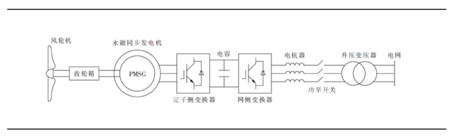 直驅技術的葉輪直接與發(fā)電機相連,省去了增速齒輪箱,轉子為永磁體勵磁,無需外部提供勵磁電源。直驅機組的發(fā)電機通過全功率變流器并網,具有效率高、噪音低、低電壓穿越能力強等優(yōu)點。