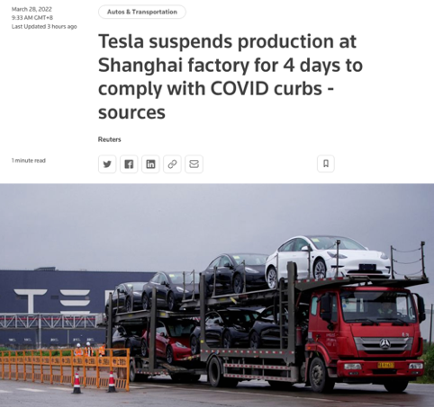 實際上同樣因為疫情防控要求,特斯拉上海工廠已于3月16日至17日連續(xù)停產(chǎn)兩天,當時特斯拉相關(guān)負責人表示將積極配合政府要求進行核酸檢測等防疫要求,同時盡最大努力保障生產(chǎn),共克難關(guān)。特斯拉上海工廠于3月18日恢復(fù)生產(chǎn),針對停產(chǎn)兩天造成的產(chǎn)量損失,特斯拉方面并未給出說明。