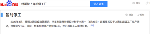 隨后汽車行業(yè)關(guān)注注意到,該消息發(fā)布沒多久,“特斯拉上海工廠暫時停工”的消息便出現(xiàn)在百度詞條上。