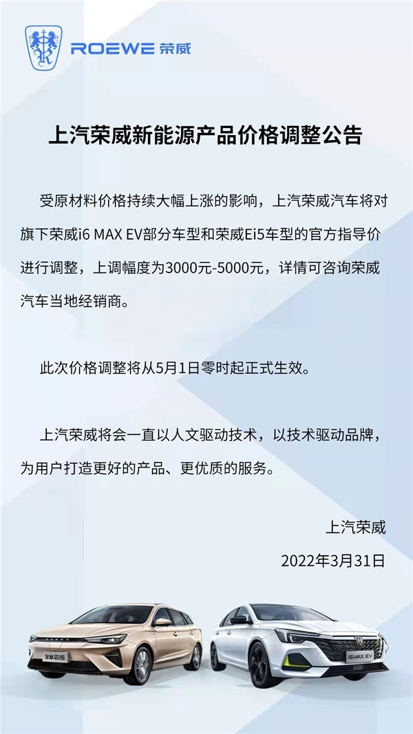 3月31日,榮威品牌官方宣布:受原材料價格持續(xù)大幅上漲的影響,上汽榮威汽車將于5月1日零時起,對旗下榮威i6 MAX EV部分車型和榮威Ei5車型的官方指導價進行調(diào)整,價格上調(diào)3000-5000元。