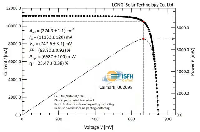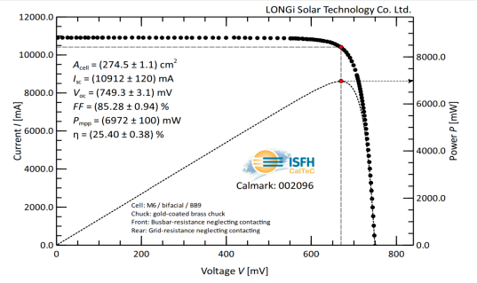 3月29日,經(jīng)德國(guó)哈梅林太陽(yáng)能研究所(ISFH)認(rèn)證,隆基采用摻鎵p型硅片制備的硅異質(zhì)結(jié)電池(p-HJT)獲得效率新突破:完全利用可量產(chǎn)工藝在全尺寸(M6尺寸,面積274.3cm)單晶硅片上,創(chuàng)造了轉(zhuǎn)換效率為25.47%的大尺寸p型光伏電池效率世界紀(jì)錄,進(jìn)一步驗(yàn)證了低成本異質(zhì)結(jié)量產(chǎn)技術(shù)的可行性。