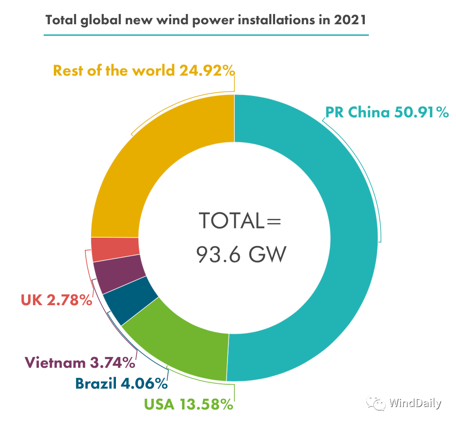 WindDaily獲悉,全球風能理事會近日發(fā)布2022年全球風電行業(yè)報告。據(jù)報告,2021年全球新增風電裝機93.6GW,中國、美國、巴西占據(jù)前三,其中中國裝機占比超過50%。單論陸上風電、海上風電新增裝機,中國也都是妥妥的全球第一。具體數(shù)據(jù)如下: