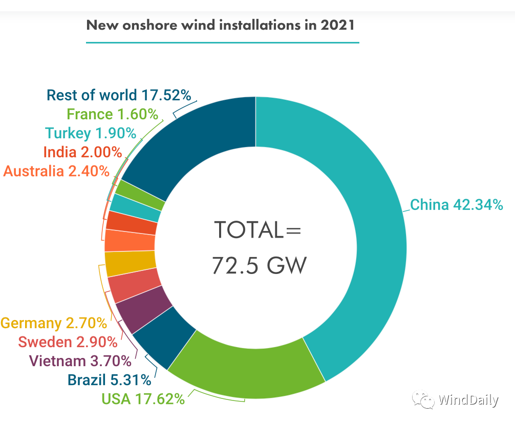 2021年全球陸上風電新增裝機72.5GW,前三為中國、美國、巴西,其中中國裝機占比42.34%。具體國家排名如下: