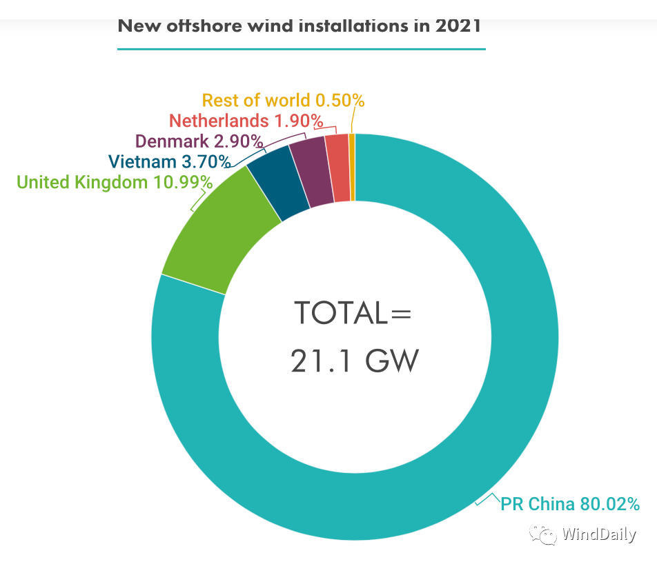 2021年全球海上風電新增裝機21.1GW,前三為中國、美國、越南,中國裝機占比達80.02%。具體國家排名如下: