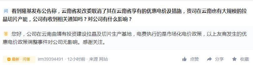 中環(huán)股份在接受媒體采訪時表示,云南取消隆基優(yōu)惠電價對公司沒有什么影響;而通威股份在接受媒體提問時則回應稱,“我們沒有收到相關的通知”。