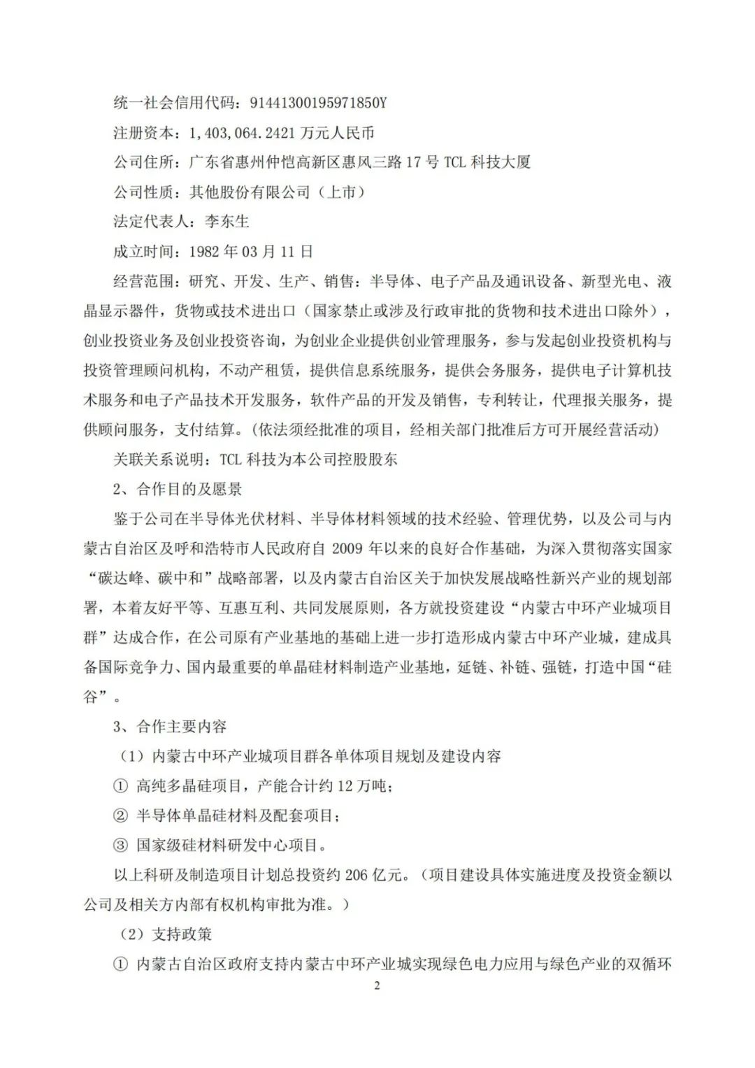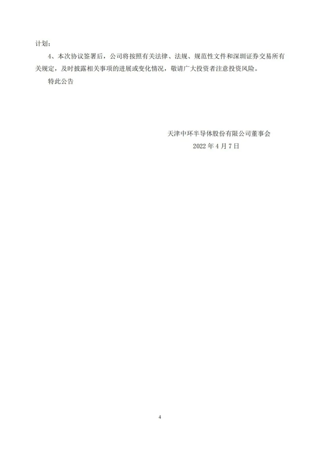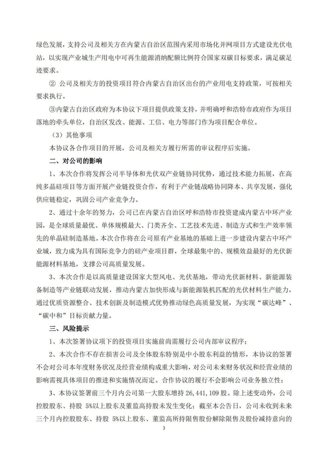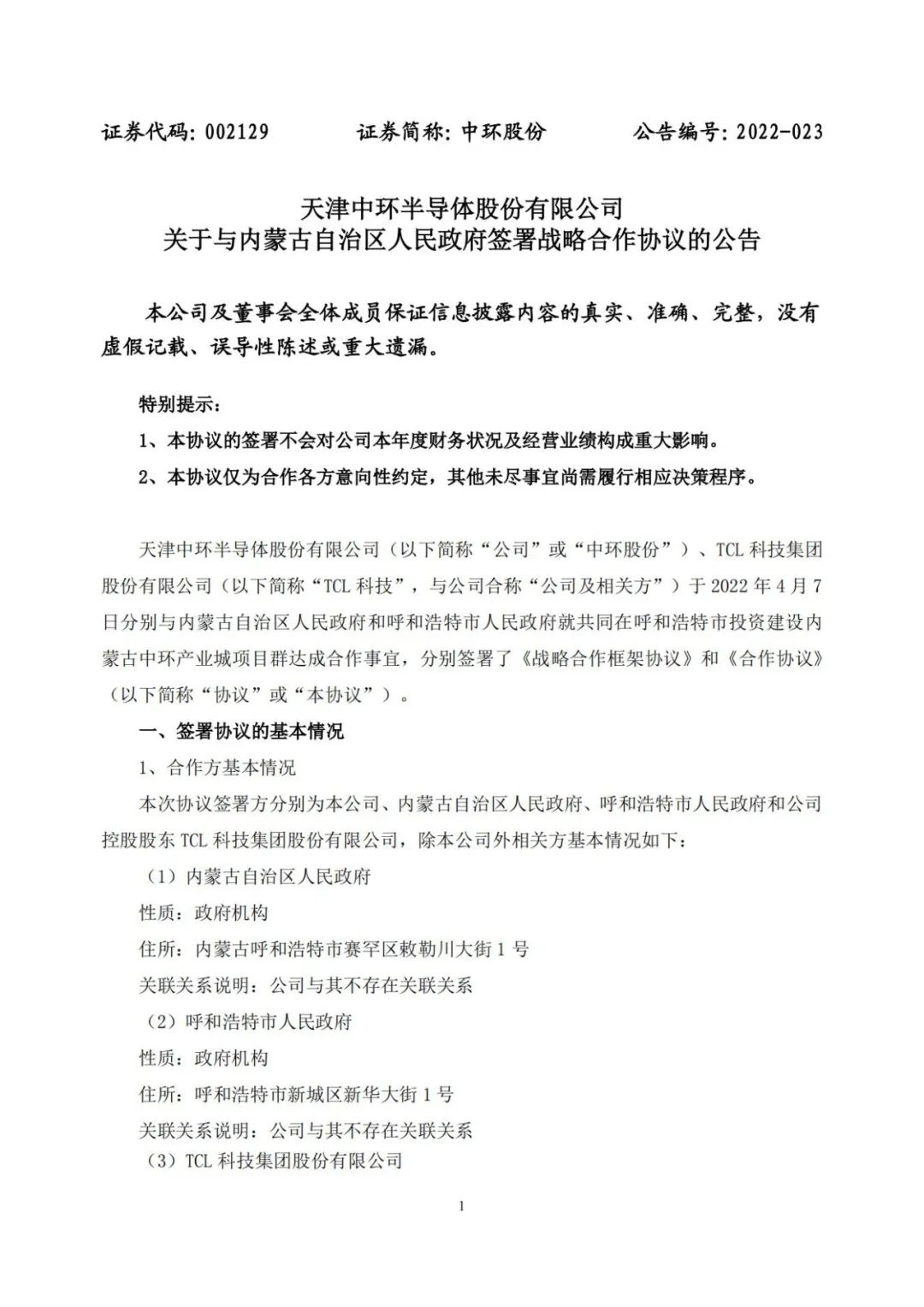 4月7日晚間,中環(huán)股份發(fā)布公告,公司、TCL科技于2022年4月7日分別與內(nèi)蒙古自治區(qū)人民政府和呼和浩特市人民政府就共同在呼和浩特市投資建設(shè)內(nèi)蒙古中環(huán)產(chǎn)業(yè)城項目群達成合作事宜,分別簽署了《戰(zhàn)略合作框架協(xié)議》和《合作協(xié)議》。