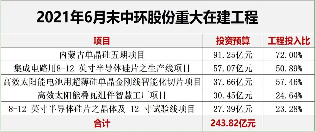 而近年中環(huán)股份在“一體化”方面也有頗多布局,且都取得了實質(zhì)性成果。比如黑鷹光伏統(tǒng)計發(fā)現(xiàn),截止2021年6月末,中環(huán)股份有五個重大在建工程,總投資額達(dá)243.82億元,涵蓋單晶硅片、疊瓦組件及半導(dǎo)體等產(chǎn)品,其中前三大在建項目工程進(jìn)度都在50%以上。