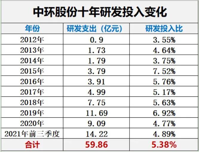 首先,我們通過企業(yè)年度研發(fā)投入規(guī)??梢钥吹狡髽I(yè)對于研發(fā)的重視程度。據(jù)黑鷹光伏統(tǒng)計,近十年間(2012年-2021年前三季度)中環(huán)股份研發(fā)投入合計超60億元,占營業(yè)收入比重達(dá)5.38%,其無論研發(fā)投入規(guī)模,還是研發(fā)投入比均位居行業(yè)前列。