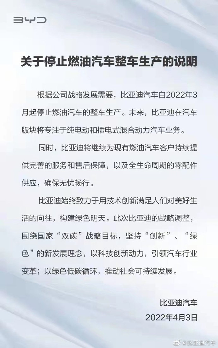 4月3日,比亞迪汽車在其官方微博發(fā)布《關(guān)于停止燃油汽車整車生產(chǎn)的說明》的公告,表示根據(jù)公司戰(zhàn)略發(fā)展需要,比亞迪汽車自2022年3月起停止燃油汽車的整車生產(chǎn)。在公告中,比亞迪方面表示,“未來,比亞迪將專注于純電動(dòng)和插電式混合動(dòng)力汽車業(yè)務(wù)。”同時(shí),公司將繼續(xù)進(jìn)行燃油汽車零部件的生產(chǎn)和供應(yīng),為現(xiàn)有燃油汽車客戶持續(xù)提供完善的服務(wù)和售后保障,以及全生命周期的零配件供應(yīng),確保無憂暢行。